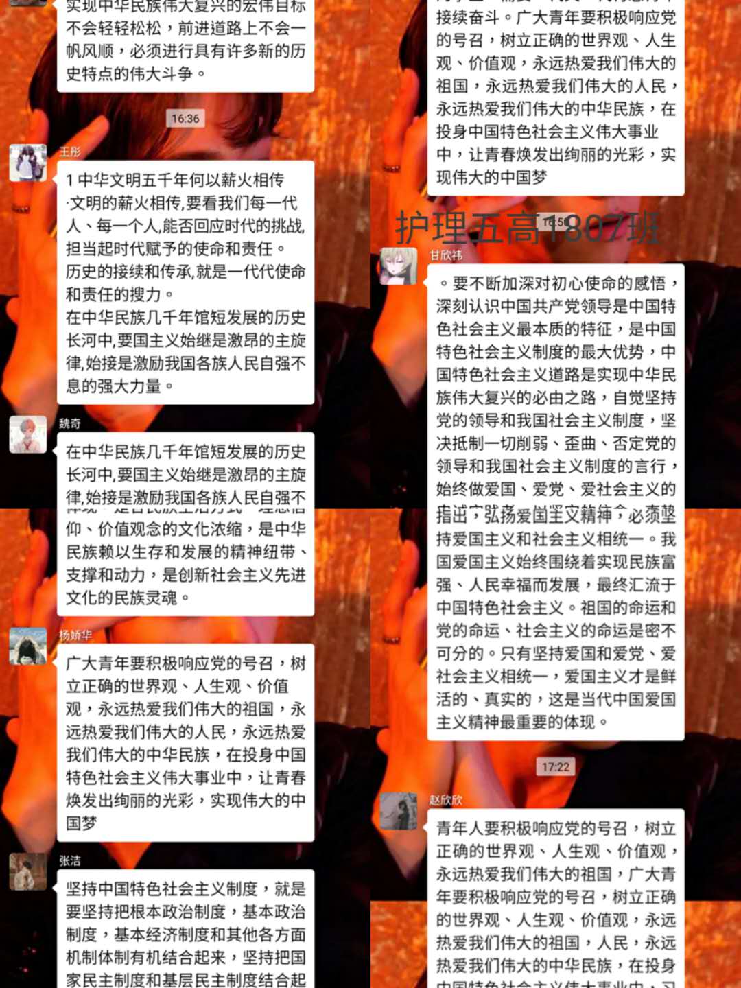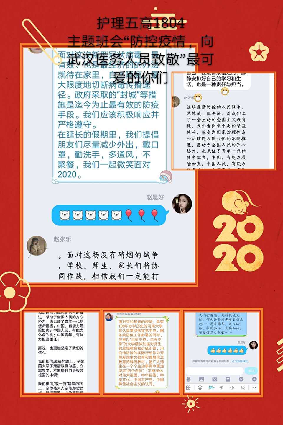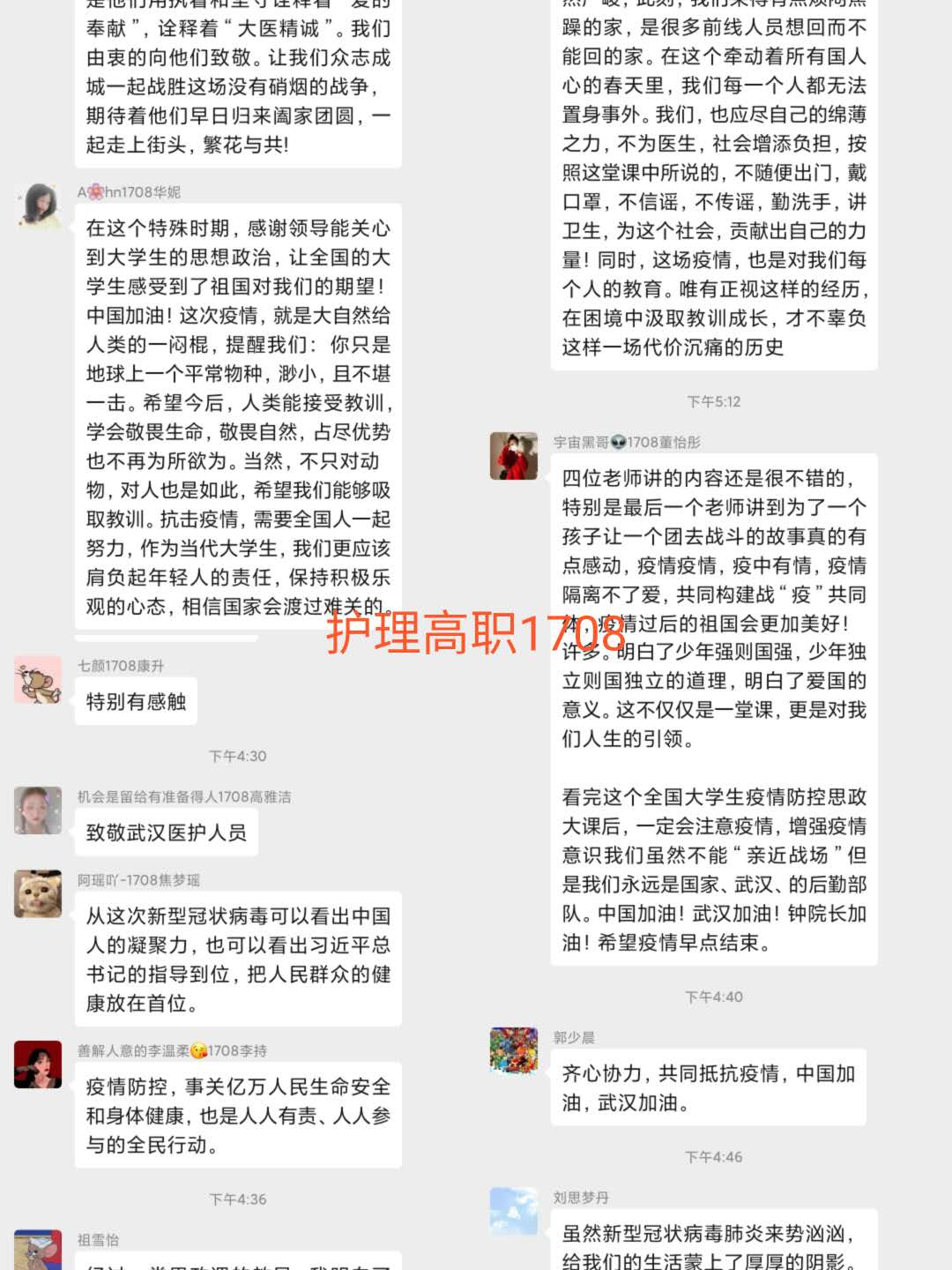 观看结束后,我院学生以班级为单位,在学管人员的指导下,开展了线上主题班会。师生们结合学科专业特点展开了讨论。买球赛十大平台党总支书记吴运胜认为:“对于买球赛十大平台的师生来说,这次思想政治教育课安排得很及时。在这场战‘疫’中,党和政府从历史中总结经验,担起人类命运共同体的责任,用‘武汉封城’的强大魄力,向世界彰显了中国共产党领导和中国特色社会主义制度的显著优势。作为党的教育工作者,我们要积极教育引导广大学生,坚定在以习近平同志为核心的党中央坚强领导下打赢这场疫情防控人民战、总体战、阻击战的信心和决心。”党总支副书记马淑红认为:“课堂中的战疫小故事,让我们看到了当代青年的大勇、大我和大德,我们要积极宣传学生身边的榜样事迹,继续引导广大青年学生勇担使命,积极奉献社会,为实现中华民族的伟大复兴梦而奋斗。”学生科科长李博认为:“这堂公开课兼具思想高度和理论深度,有数据有实例,有情感有温度,进一步增强了大学生的‘四个自信’,激发大学生的爱国热情和创新创业的动力。”护理高职1804班学生王晔在班会中说:“作为一名00后护生,我们要牢记医学生誓言和南丁格尔誓言,向奔赴疫情前线的前辈学习,做到胸有大志、心有大我、肩有重任、行有大德,用实际行动谱写自己大写的青春。”(撰稿:买球赛十大平台 王蓉 审核:李晓乾)