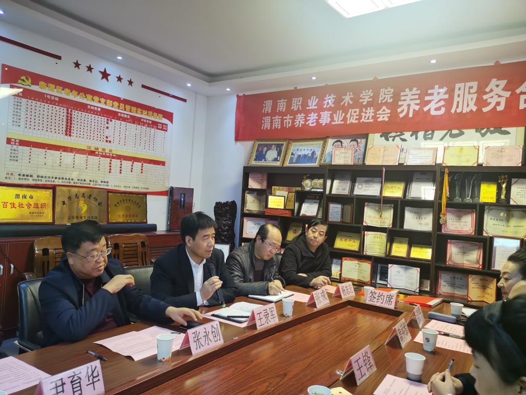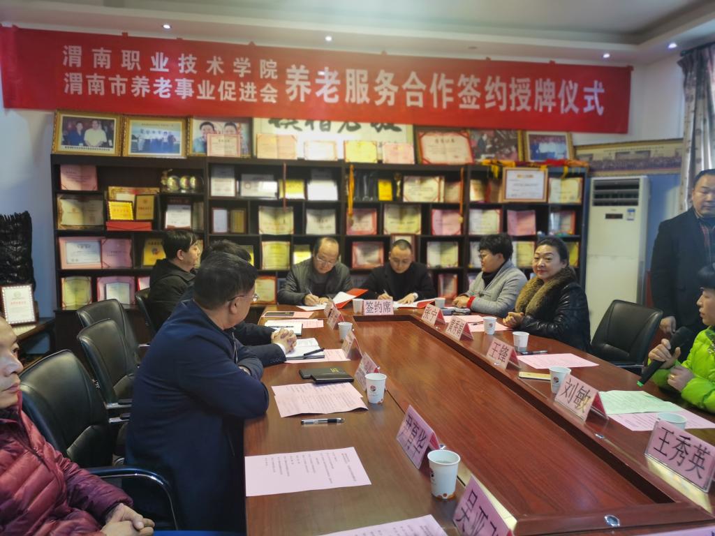 为推动渭南养老服务与管理事业发展,提升我院学生的养老服务能力与素养,12月13日下午,买球官网与渭南市养老事业促进会在临渭区老年公寓签订了合作协议,并举行了老年服务与管理专业首个校外实训基地挂牌仪式。渭南市民政局副局长张永创、社会福利科科长杨志宏,渭南市养老事业促进会会长王锋、临渭区老年公寓院长黄秀娟,买球官网副校长王录军、对外交流合作处处长尹育华、买球赛十大平台院长张成、副院长吴亚飞,老年服务与管理专业带头人任秋爱等出席会议。