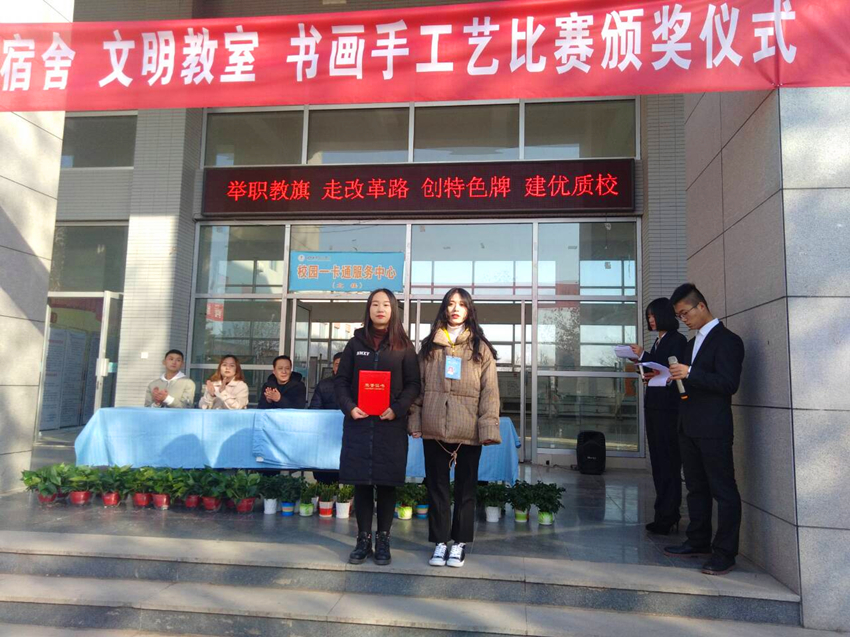 为了创建文明校园,提高我院学生文明素质,弘扬学生创新精神,12月12日下午,买球赛十大平台在公共教学楼前举办了买球赛十大平台文明教室、文明宿舍以及手工艺品大赛颁奖仪式。我院学生科科长李博,副科长苏建军,辅导员任鑫老师及百余名学生代表参加此次颁奖仪式。此次颁奖仪式由韩雨柔、黄朝祥主持。