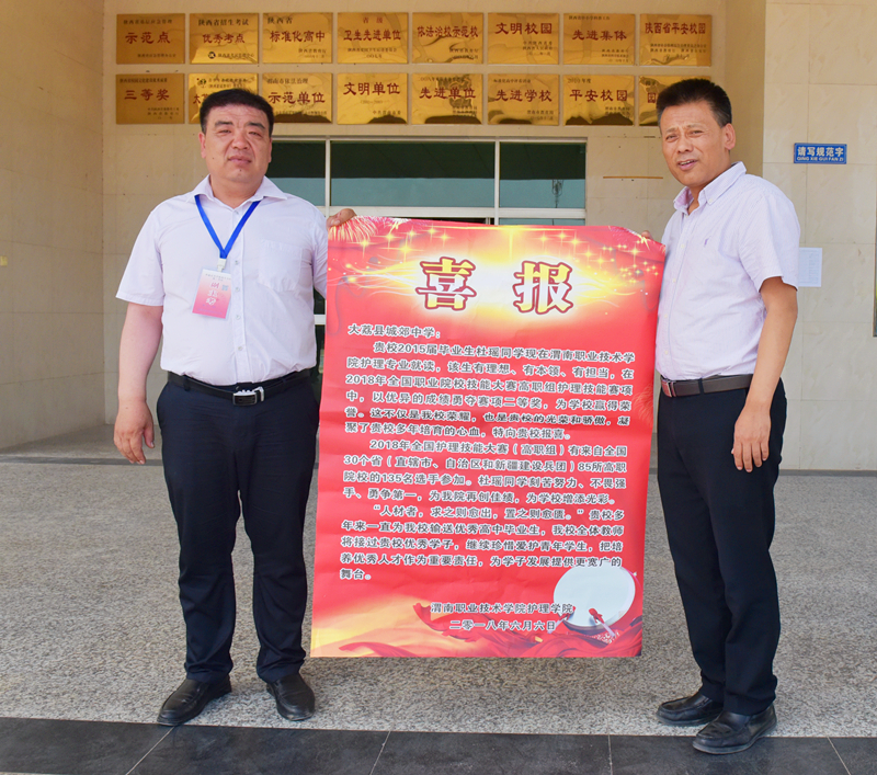 6月6日下午,买球赛十大平台领导班子的到来让大荔城郊中学、临潼中学、学生杜瑶和牟洋洋家热闹起来了。在母校师生、邻里乡亲羡慕的关注中,两所中学的领导及学生家长欣喜地接过我院党总支书记吴运胜、院长张文信手中的喜报,共庆两位学生在2018年全国职业技能大赛(高职组)护理技能赛项中喜获佳绩。