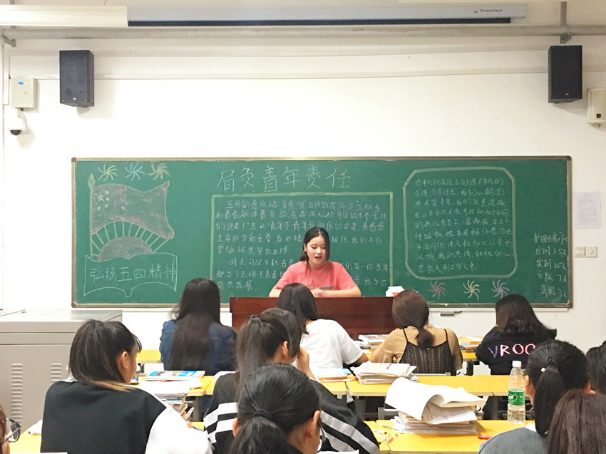 各班团支书带领同学们一起回顾了近代历史中共青团的成长足迹,重温了“五四”精神,介绍了主要领导人物陈独秀和李大钊的光辉事迹,让同学们对五四的“爱国、进步、民主、科学”精神有了进一步的了解。同学们一起学习了习近平总书记五四青年节在北大师生座谈会上的讲话精神。同学们表示:作为一名当代大学生应为中华民族的强盛而不懈奋斗,为我们共同的家园、共同的理想奋发图强。