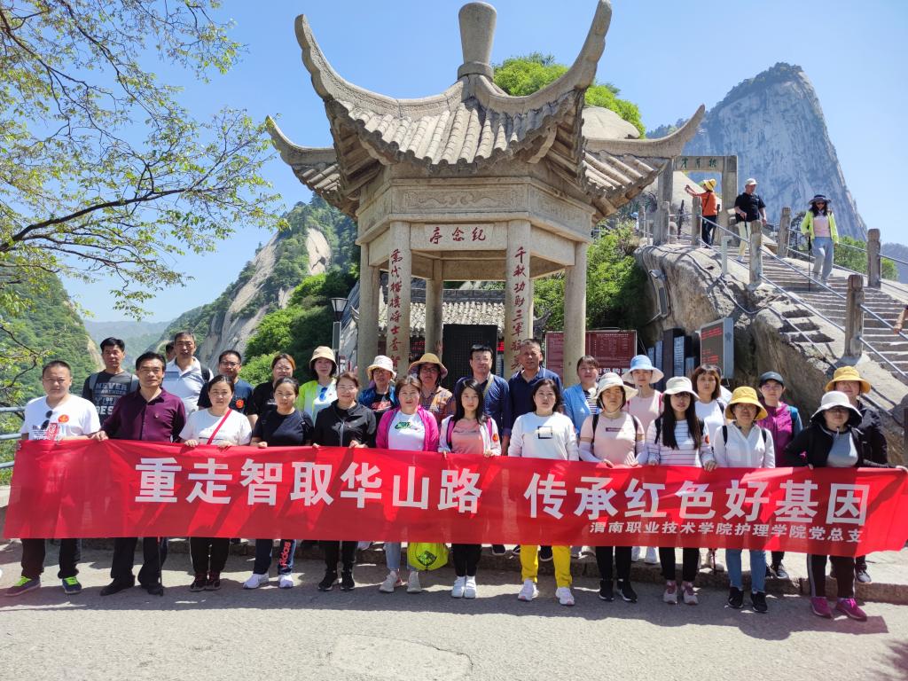 穿越时空精神之旅,触摸烽火岁月印记。在重走智取华山路上,大家沿着当年八勇士的红色足迹拾阶而上,时而奋力攀爬,时而手脚并用,共唱红歌鼓舞士气,用实际行动体验了当年革命先辈钢铁般的意志和不怕牺牲的大无畏精神,全身心地感受“神兵飞跃天险 英雄智取华山”的红色传奇。在征服完全程两公里约4000级台阶后,大家汇聚“解放华山”纪念亭留念。大家兴致勃勃地观看了电影《智取华山》,对八勇士智取华山的英雄事迹有了更加深刻的认识,为他们的机智勇敢、以少胜多、解放华山的英勇无畏精神报以阵阵掌声。