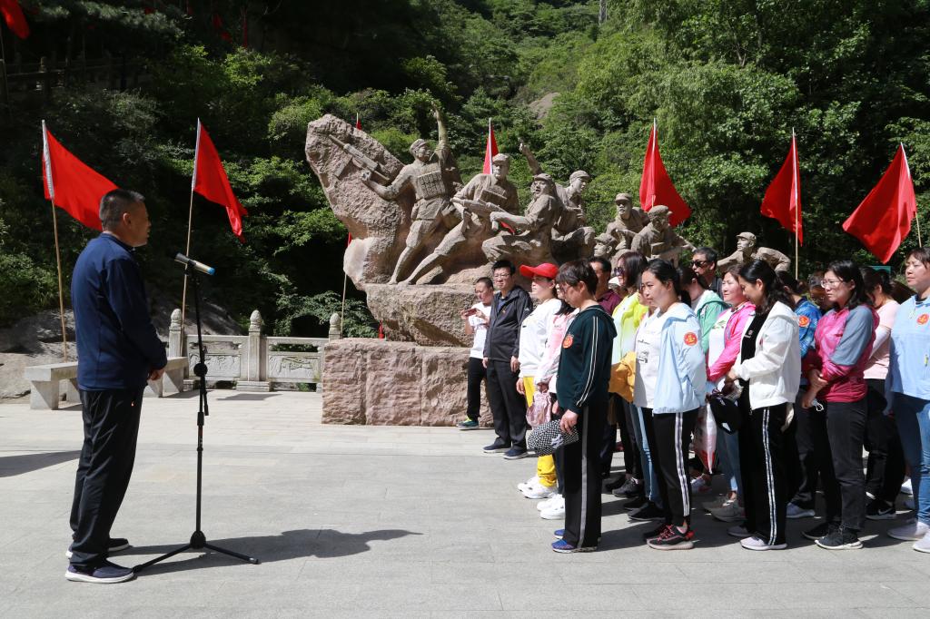 30余名党员干部及教师代表在“智取华山八勇士”的群雕前,聆听了智取华山的革命事迹。每一位参与活动的党员都被八勇士不畏艰险让五星红旗高高飘扬在华山之巅的英雄壮举深深震撼,被他们不怕牺牲、永攀高峰的精神所鼓舞。