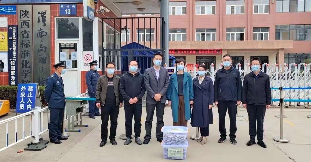 近日来陕西疫情呈现多发趋势,在防控新型冠状病毒肺炎疫情的关键时期,3月17日上午,学校宣传部融媒体负责人吴亭、买球赛十大平台党总支副书记李晓乾、招生就业科副科长何宇一行,为渭南高新中学、渭南技工学校、临渭区幼儿师范学校奋斗在抗疫一线的教职工送去了买球官网医学院中药研究所研制的抗疫汤剂“渭水避瘟汤”1080剂。