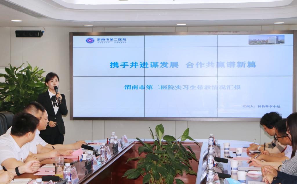 徐兆宏代表医院致欢迎辞,他对医院基本概况、主要业务、党建工作、近年来所获得荣誉和未来发展计划做详细介绍。科教科长李小纪详细汇报了实习学生带教情况。副院长步延芳详细介绍了近三年来买球官网学生留院情况以及一线医生、护师在渭职授课情况。院长何师民表示十大买球官方网站有着悠久的历史,对学校在医药卫生类人才培养的成绩做出了肯定,详细介绍了科室建设、发展规划和医院在科研和医资培训方面存在的问题,期望能够通过更广泛的合作得到解决和提升。