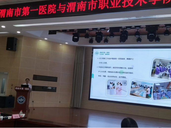 渭南市第一医院书记冯晓峰代表医院致欢迎辞,他指出作为买球官网的实习教学医院,院方会一如既往精心带教、严格管理。希望医校双方本着优势互补、共同发展、互信双赢的原则,在师资培养、专业建设、学生实践等方面开展深度合作,进一步探索高等教育与医疗卫生事业协同发展的新型合作模式,从而达成医院与学校共同成长、共同发展的“双赢”目标,为我市医疗卫生事业的腾飞而不懈努力。