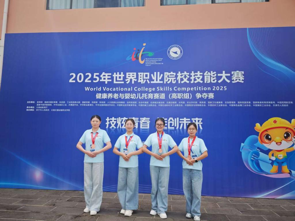 8月28日至9月2日,2025年世界职业院校技能大赛健康养老与婴幼儿托育赛道(高职组)在云南交通运输职业学院举办。本届大赛共吸引来自全国155支代表队、601名选手参赛。我院高度重视此次赛事,买球赛十大平台派出了由副院长任秋爱教授带队,董玉芬、何宇等指导教师全程陪同,智慧健康养老服务与管理专业的杨卓越、赵可妍、常秀秀、刘琳钰等4名同学组成的师生代表队参赛。赛场上学生凭借扎实的专业功底、规范的实操能力和出色的临场表现,最终荣获铜奖。