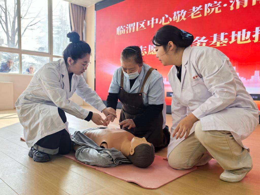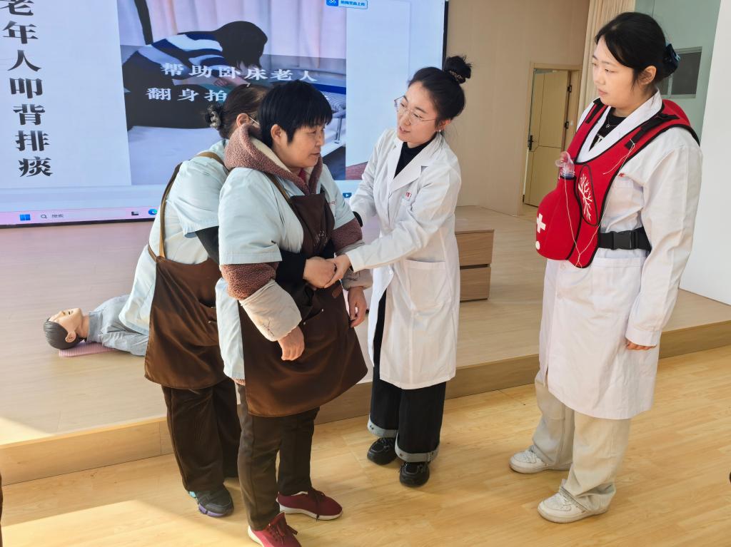 会前,为切实提升敬老院职工的应急处置能力,买球赛十大平台教师白聪聪与学生代表郭楚嫣面向职工围绕心肺复苏(CPR)、老年人噎食急救(海姆立克法)、正确拍背排痰等关键技术展开急救技能培训。培训中,参训人员逐一进行实操演练,在指导教师的及时纠正与细节提示下,逐步掌握动作规范与处置要领。