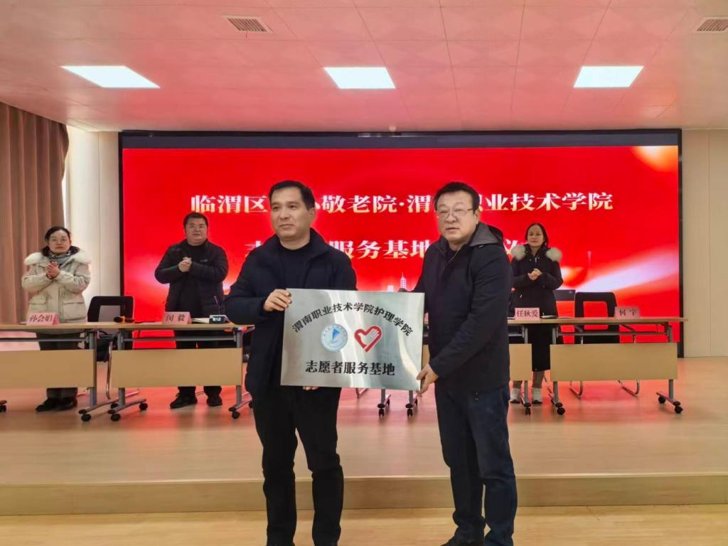 为进一步加强养老服务人才队伍建设,深化校地合作与产学共赢,推动职业教育资源服务地方发展,12月16日,买球赛十大平台与临渭区中心敬老院举行“志愿者服务基地”授牌仪式暨座谈会。渭南市临渭区民政局党工委委员、副局长王潇,临渭区中心敬老院院长闵毅,买球赛十大平台院长张成、副院长任秋爱、教学科副科长孙会娟、招生就业科科长何宇等参加了本次活动。