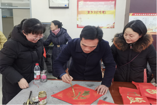 活动现场墨香四溢、喜气洋洋。教学支部的党员教师们早早地准备好了笔墨纸砚,摆好对联。党员郭宇森老师挥毫泼墨,将新春祝福融入一副副寓意吉祥的春联和“福”字之中。前来领取春联和“福”字的教师络绎不绝,他们在一幅幅作品前驻足欣赏,挑选着自己心仪的春联,脸上都洋溢着幸福的笑容。