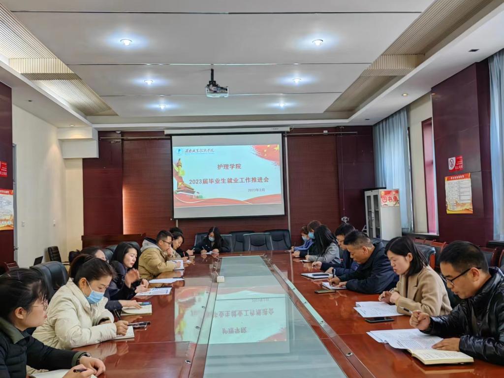 2月27日下午16:30,买球赛十大平台在医训楼第一会议室召开了2023届毕业生就业工作推进会。买球赛十大平台党总支书记吴运胜、院长张成、党总支副书记周梦花、学生科副科长姚飞、招生就业科副科长何宇以及毕业班毕业班辅导员、班主任参加了会议。会议由周梦花主持。