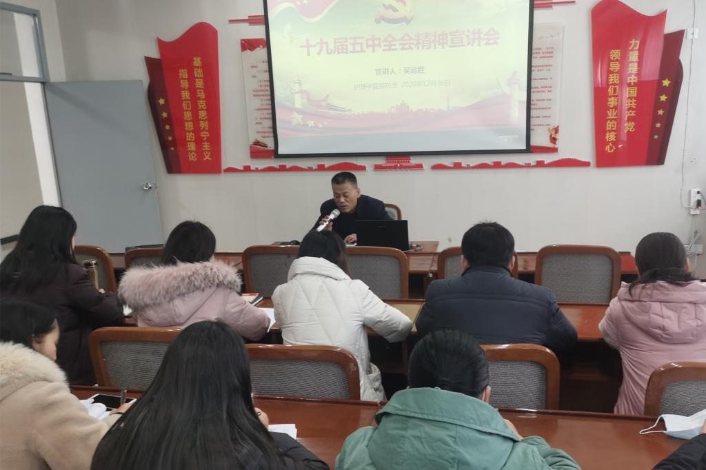12月30日下午,买球赛十大平台党总支组织全体党员干部、20余名入党积极分子及教师代表在医训楼南楼第二会议室召开了学习贯彻党的十九届五中全会精神宣讲会,我院党总支书记吴运胜担任主讲,党总支副书记李晓乾主持了宣讲会。