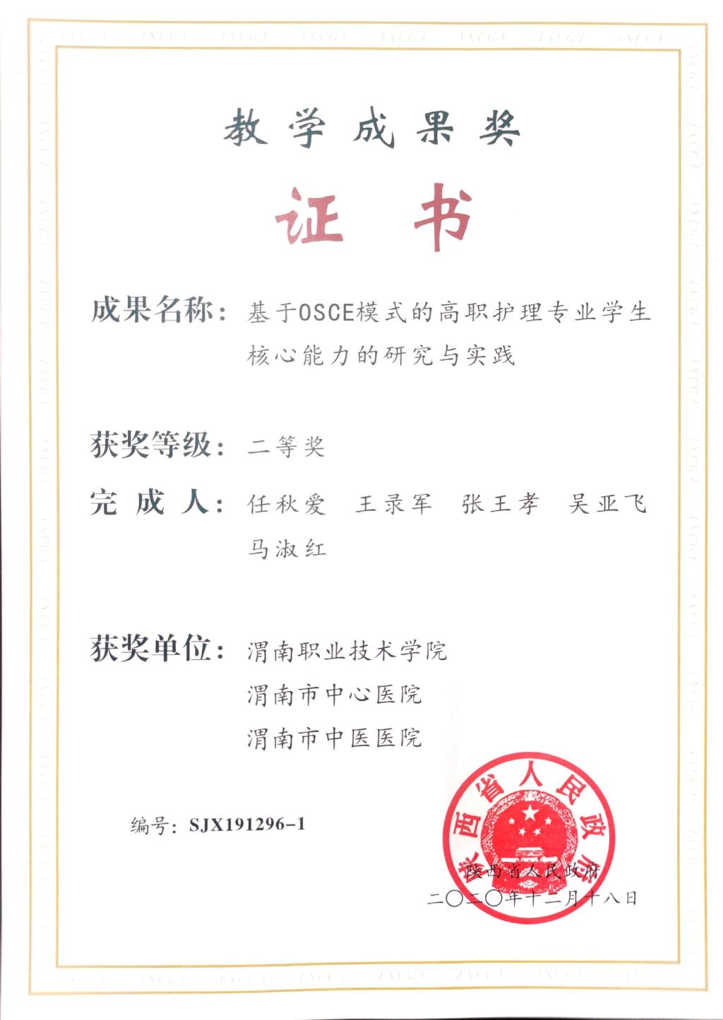 近日,陕西省人民政府办公厅下发了《关于表彰2019年高等教育教学成果奖获奖项目的通报》(陕政办函〔2020〕137号),买球官网买球赛十大平台“基于OSCE模式的高职护理专业学生核心能力的研究与实践”荣获省级教学成果二等奖1项,这是买球赛十大平台第二次荣获该奖项。