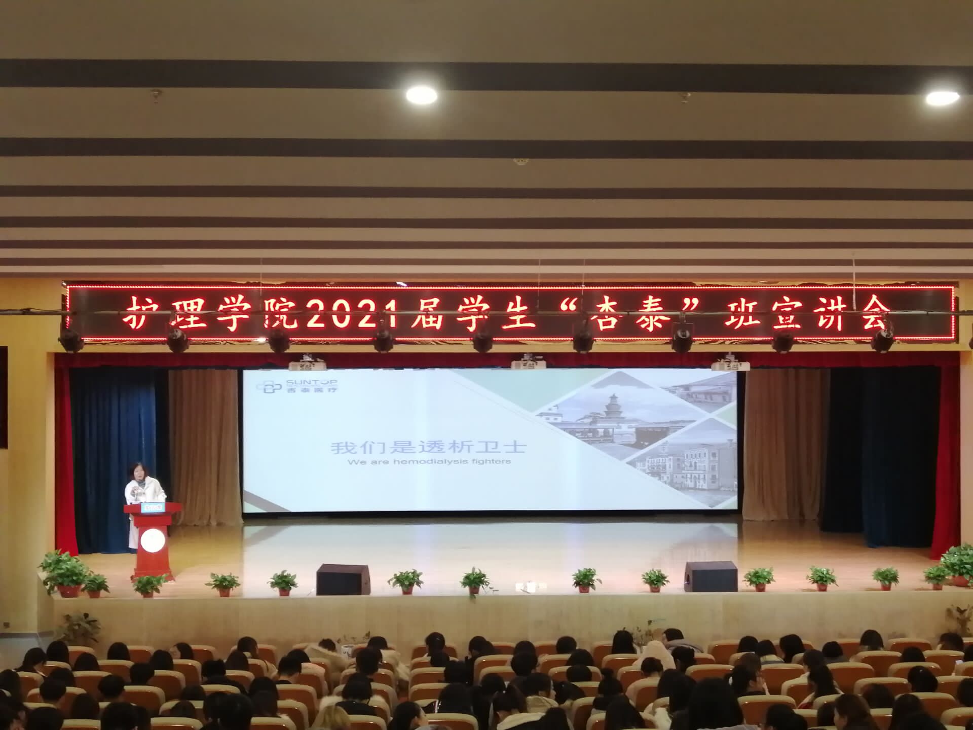 为拓宽学生实习就业渠道,提高学生职业素养,12月9日下午,买球赛十大平台在图书馆报告厅举行了2021届学生“杏泰”班宣讲会,我院副院长吴亚飞,教学管理科副科长李晓乾,王媛等教师代表及2018级高职全体学生参加了宣讲会。宣讲会由“杏泰血透”订单班主要负责老师蒋婵婵主讲,吴亚飞主持了宣讲会。