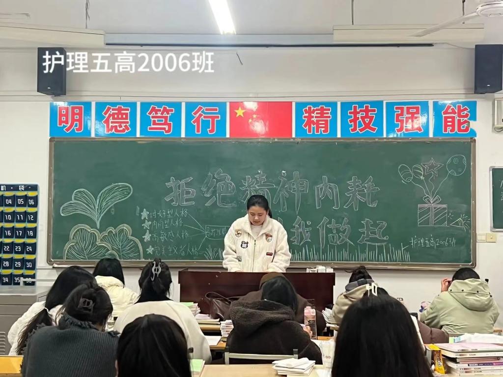 课上,心理委员主要从精神内耗的定义、识别容易精神内耗人群及反内耗技巧等方面开展课程,详细介绍了有关精神内耗方面的各种问题。让同学们对心理内耗有深入浅出的认知和了解,同时同学们与心理委员进行互动交流,发表自己拒绝“精神内耗”的独特见解,并使同学们清晰认识到,停止消极的精神内耗,做自己情绪的主人,开始与众不同、璀璨的人生。